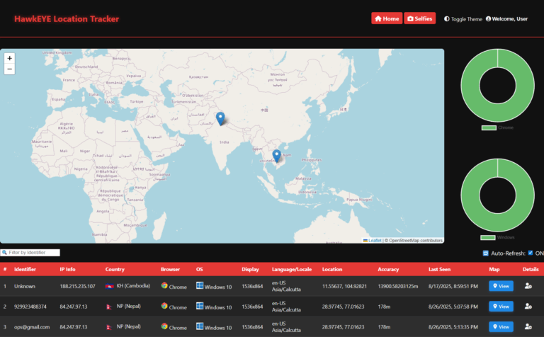 HawkEye Intelligence is a powerful GPS tracking software designed for precision monitoring and smart insights. With real-time GPS tracking with IP address, Device Fingerprinting, and Metadata Collection, it delivers unmatched visibility across multiple devices. Features like Historical Analysis, Geofencing Alerts, and multi-device coordination ensure you never miss a detail. Advanced tools such as Webcam Selfie Capture enhance security, while the interactive dashboard centralizes all data for effortless analysis, decision-making, and complete situational awareness.